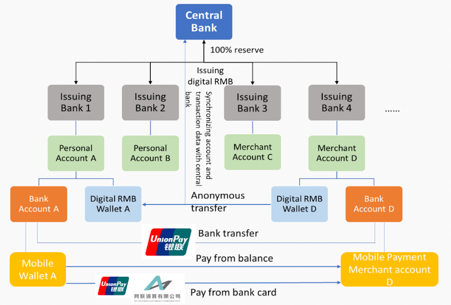 The d-RMB transactions, which may be anonymous between users, are managed by the issuing agencies, with account and transaction information synchronized with the central bank. This would be supplementary to bank transfers and mobile payments, which are cleared and settled through UnionPay, NUCC, or inside the mobile payment companies.